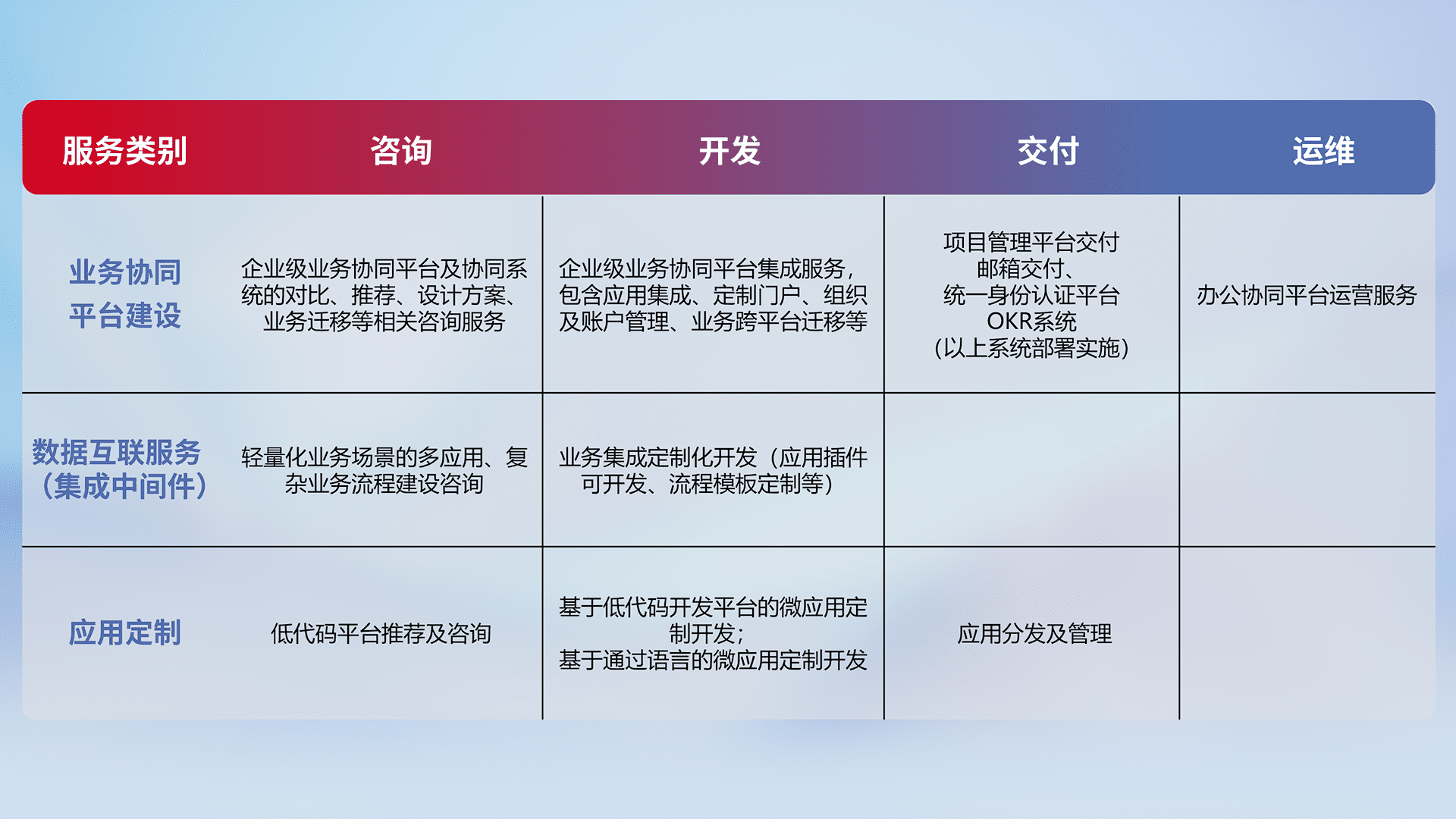 针对钉钉、、、、企微、、IDaas等平台级产品提供产品的规划、、方案、、、交付、、定制化开发等服务,,实现如统一协同办公、、、智能客户服务、、、、混合会议管理、、、、智能数据查询、、、、等业务场景,,,实现数字化转型。。。